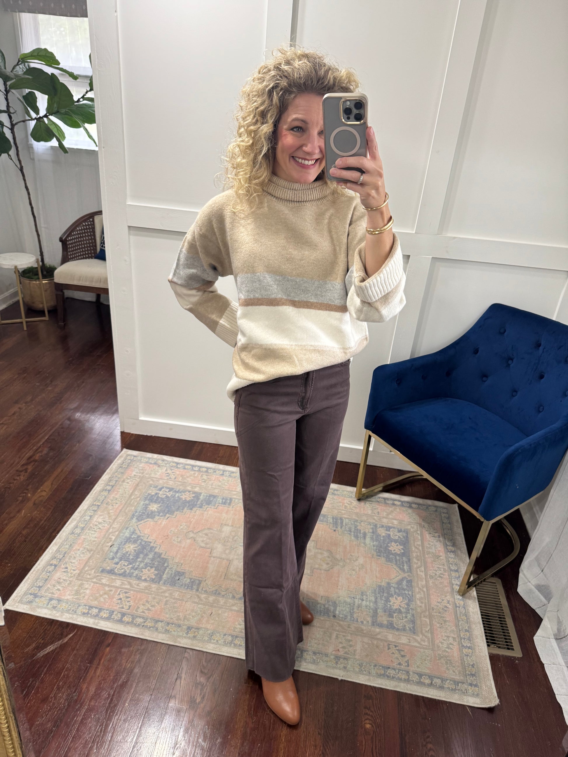 Mock neck sweater in taupe with grey, brown and ivory stripes.