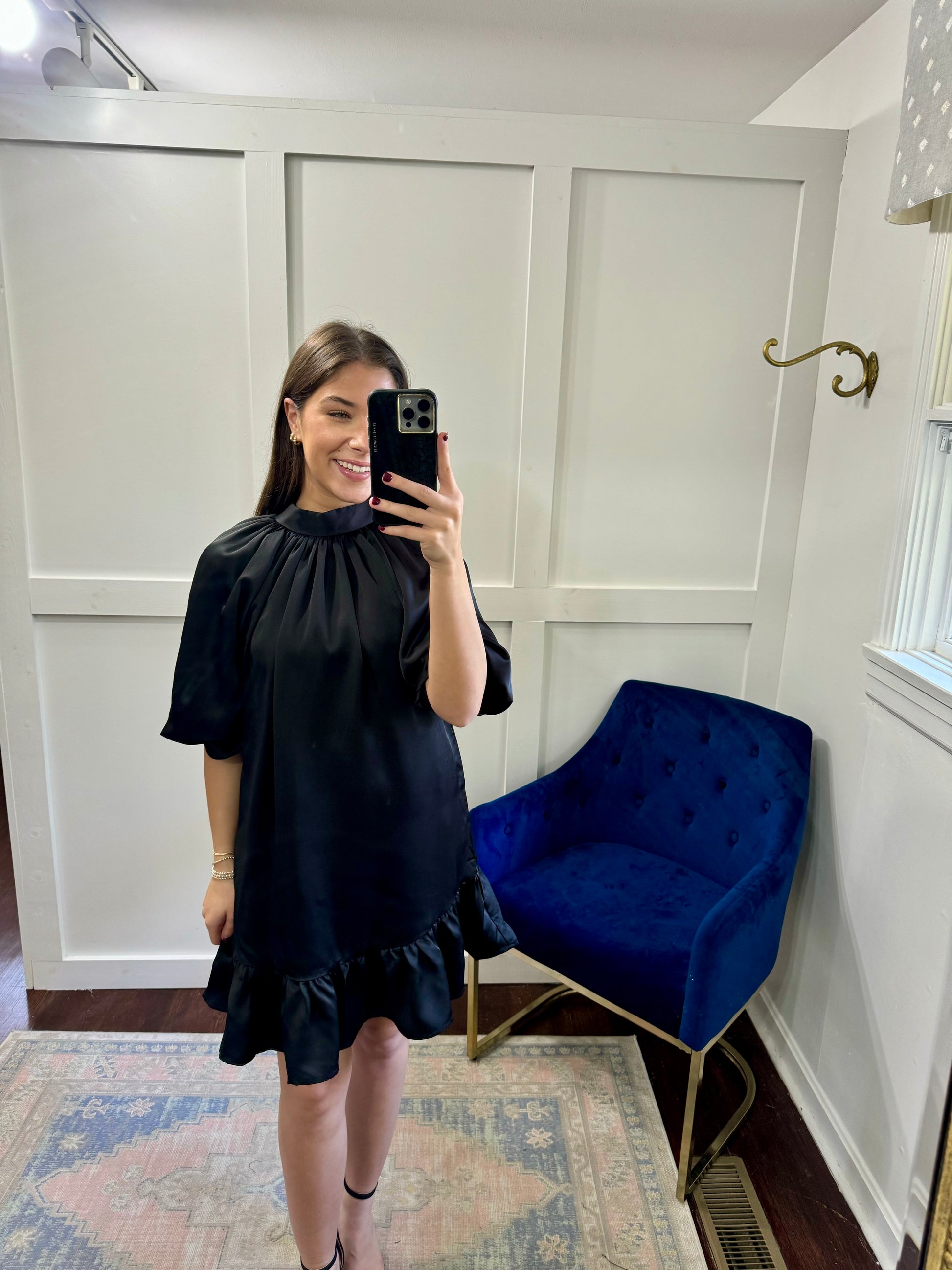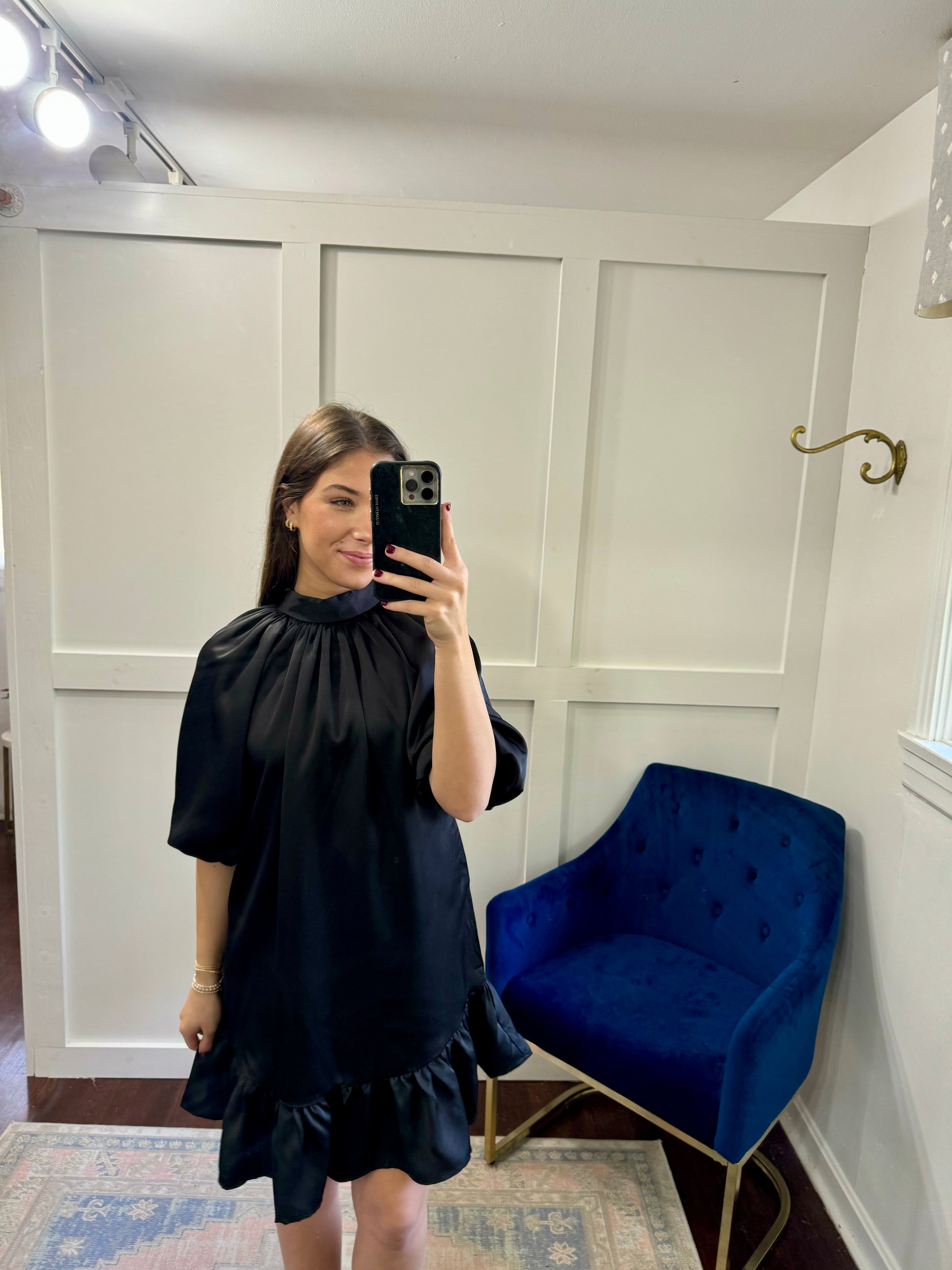 Black satin puff sleeve dress with bow tie at back of neck and ruffle hem. Such an elegant dress for your next holiday event or wedding.