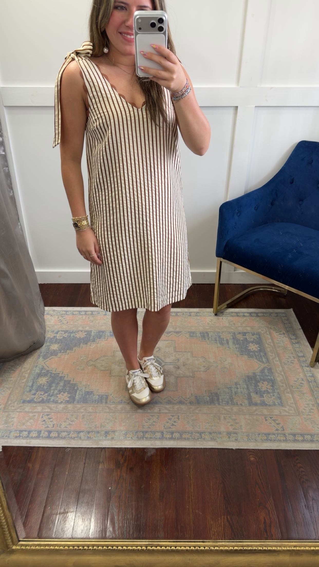 Brown and cream striped dress with tie shoulders and ric rac trim detail. Fully lined