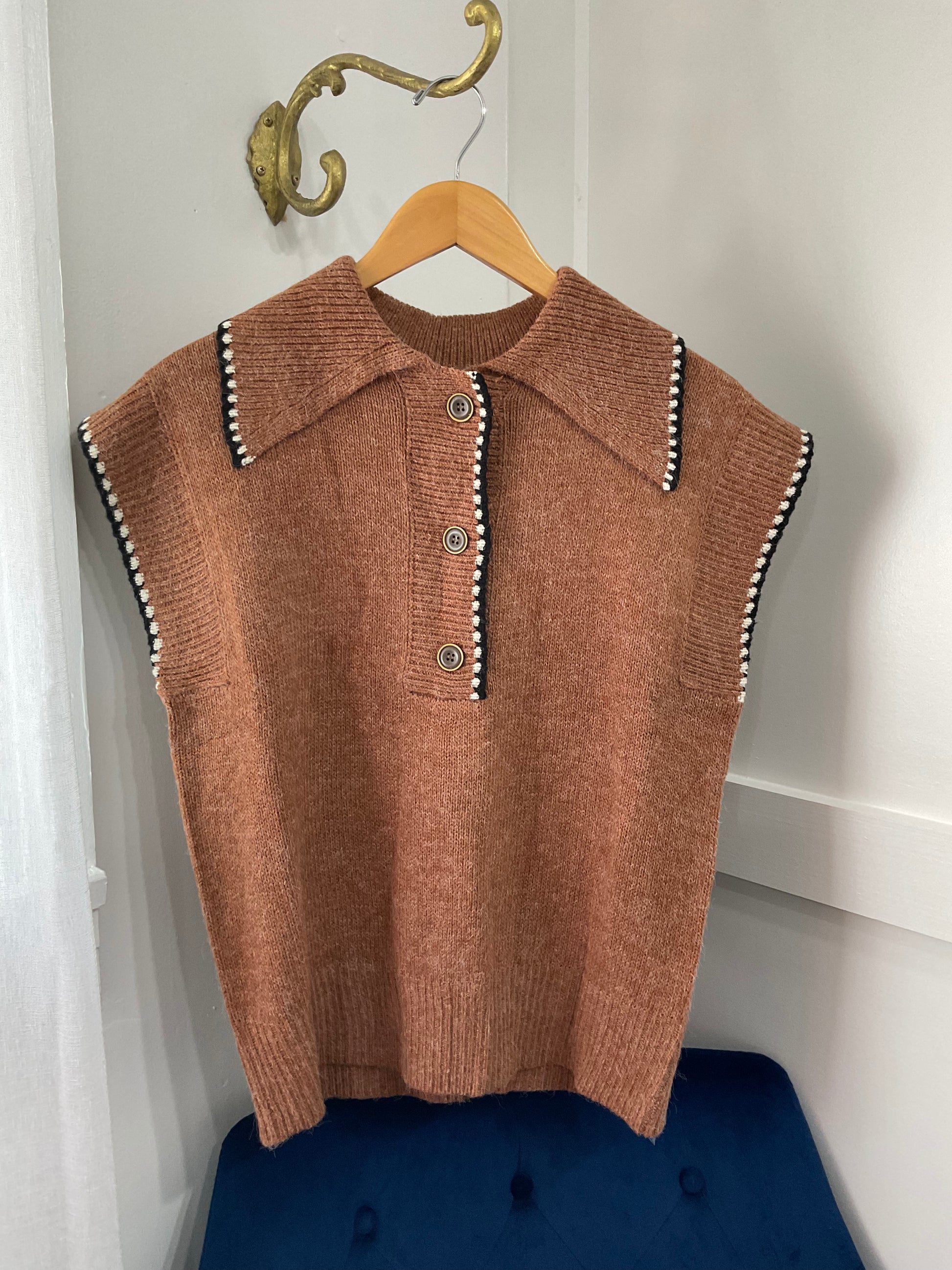 Chocolate brown short sleeve sweater top with white and black stitching detail. Don’t forget to add the matching pants to compete the set.