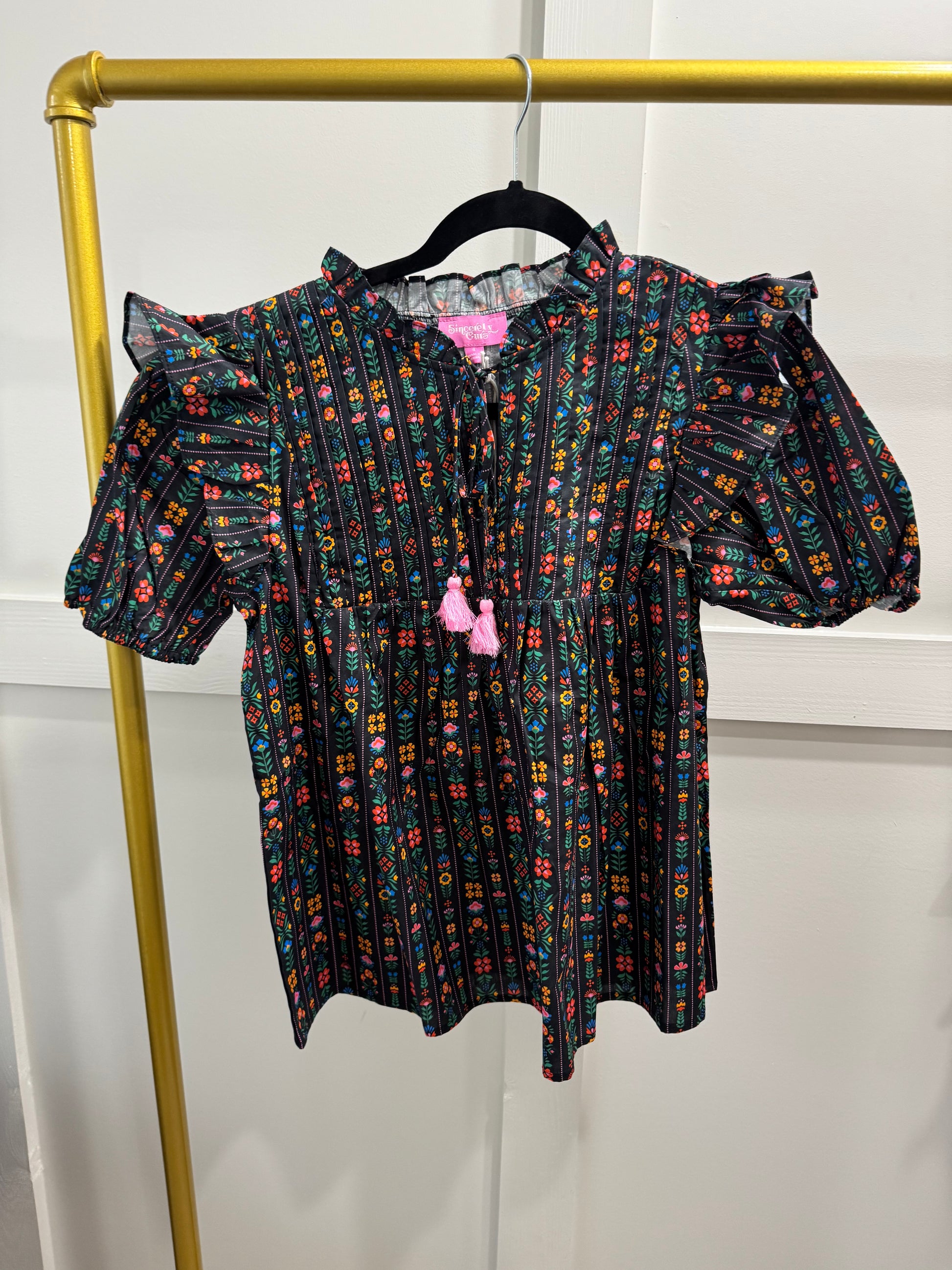 Black puff sleeve top with ribbon floral pattern and tassel tie at neck