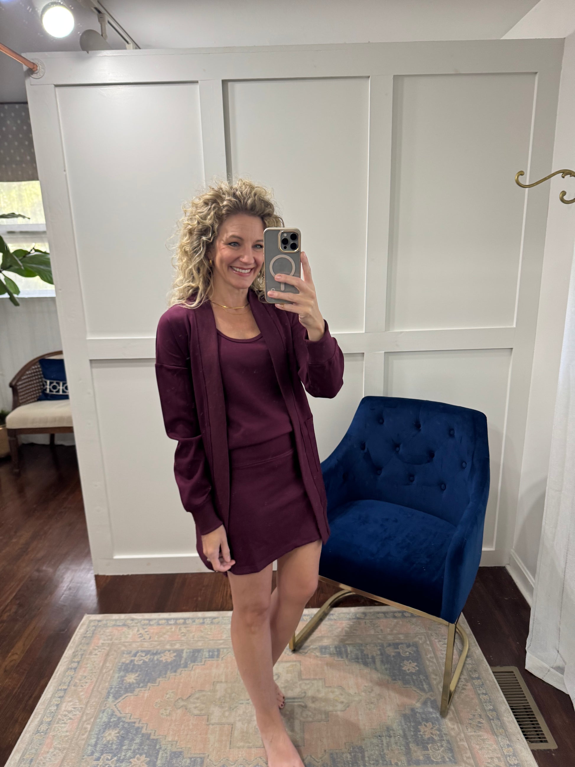 Port burgundy cardigan with ribbed contrast trim and self belt