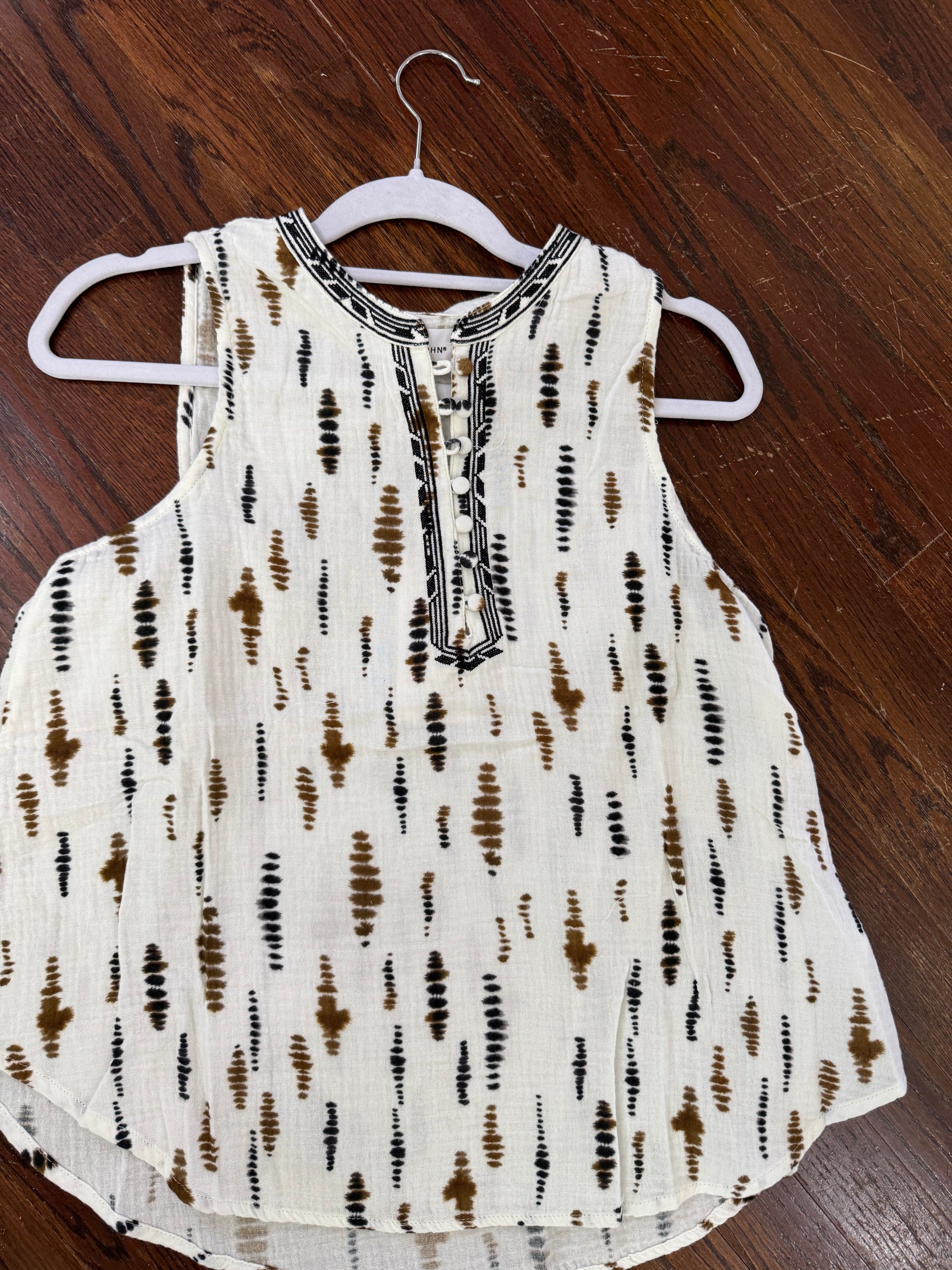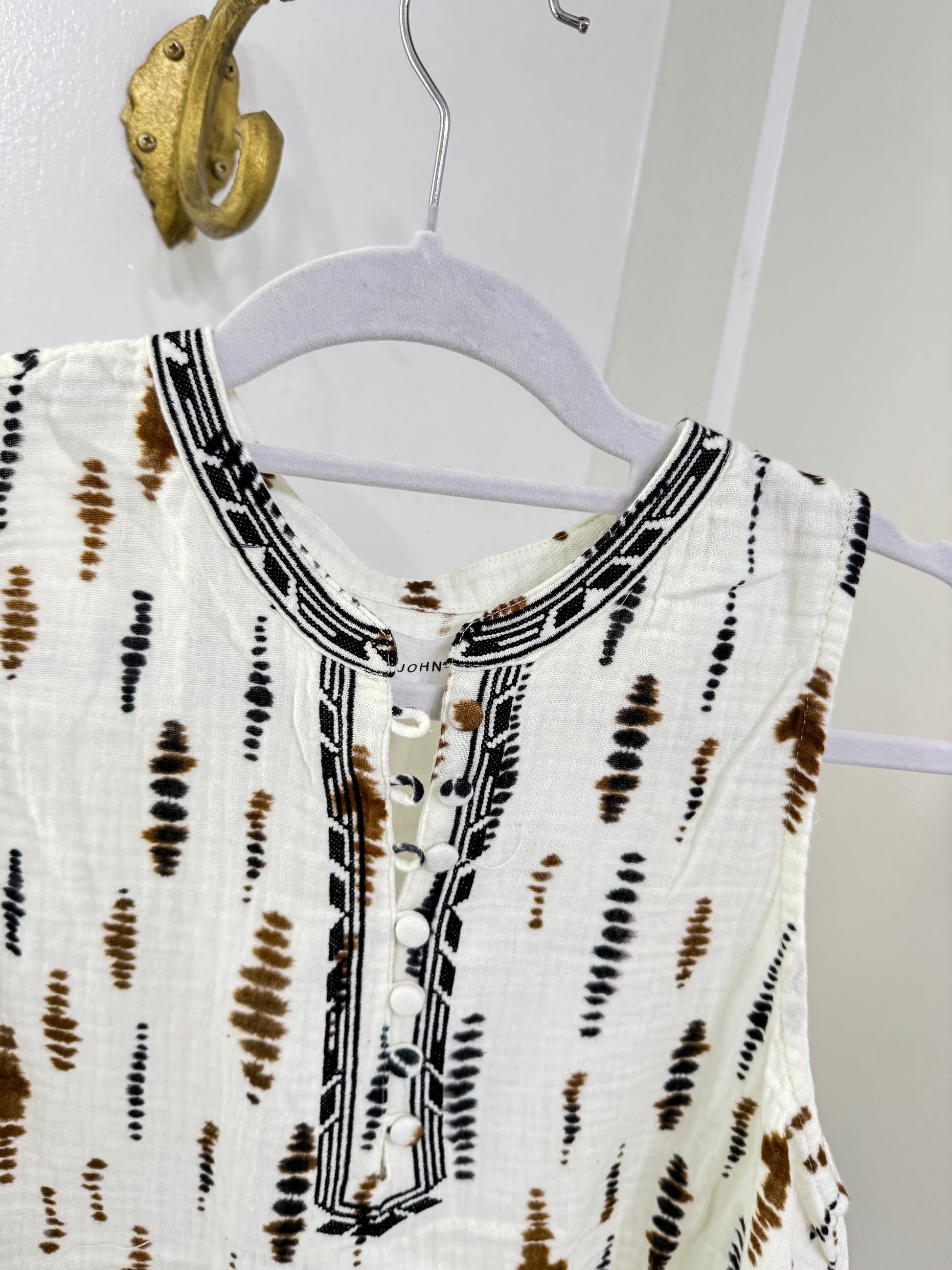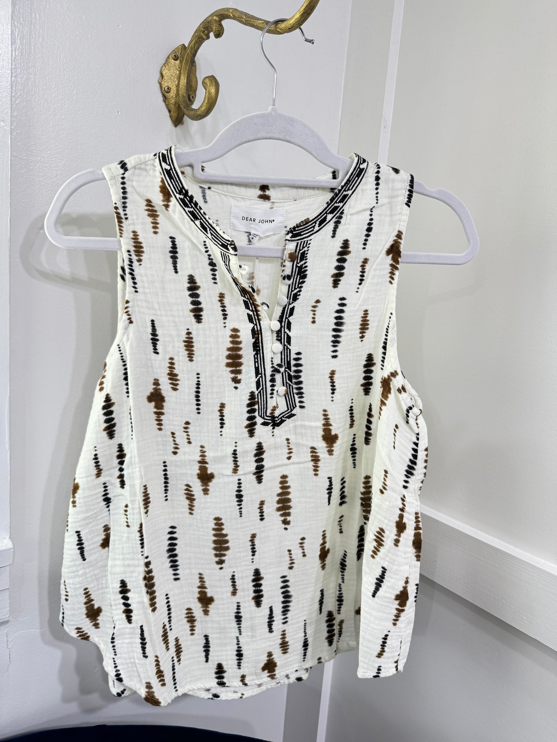 Dear John gauze sleeveless top with cream brown and black details. This top is the epitome of art and fashion combined. Embroidered details and covered button detail.