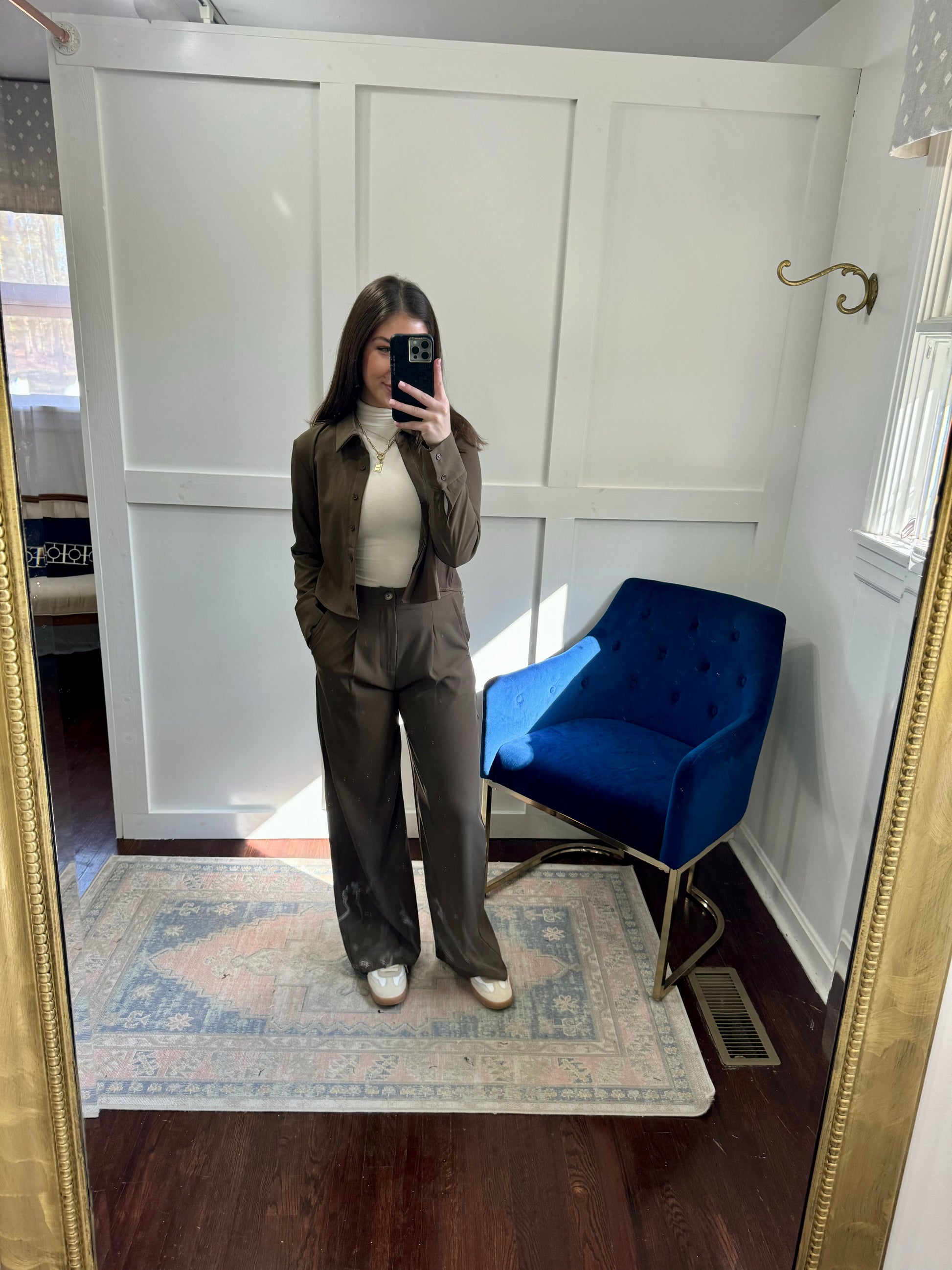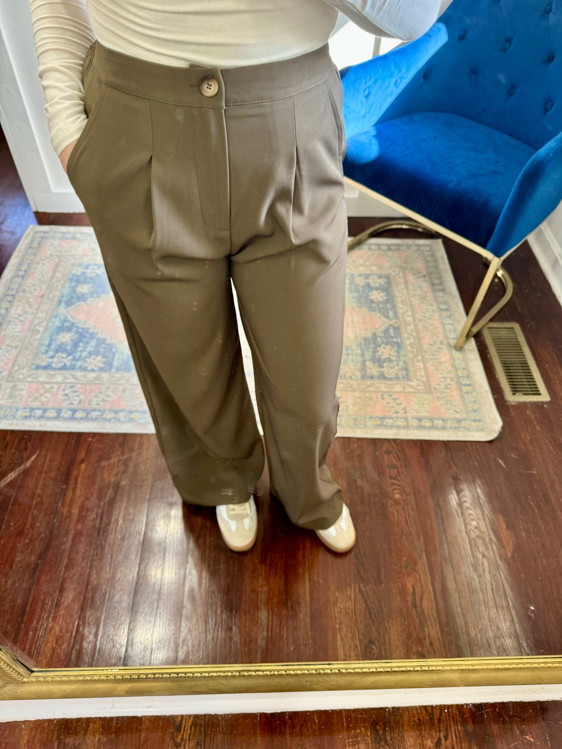 Pleat front pants in olive brown. Don't forget the matching button down top.