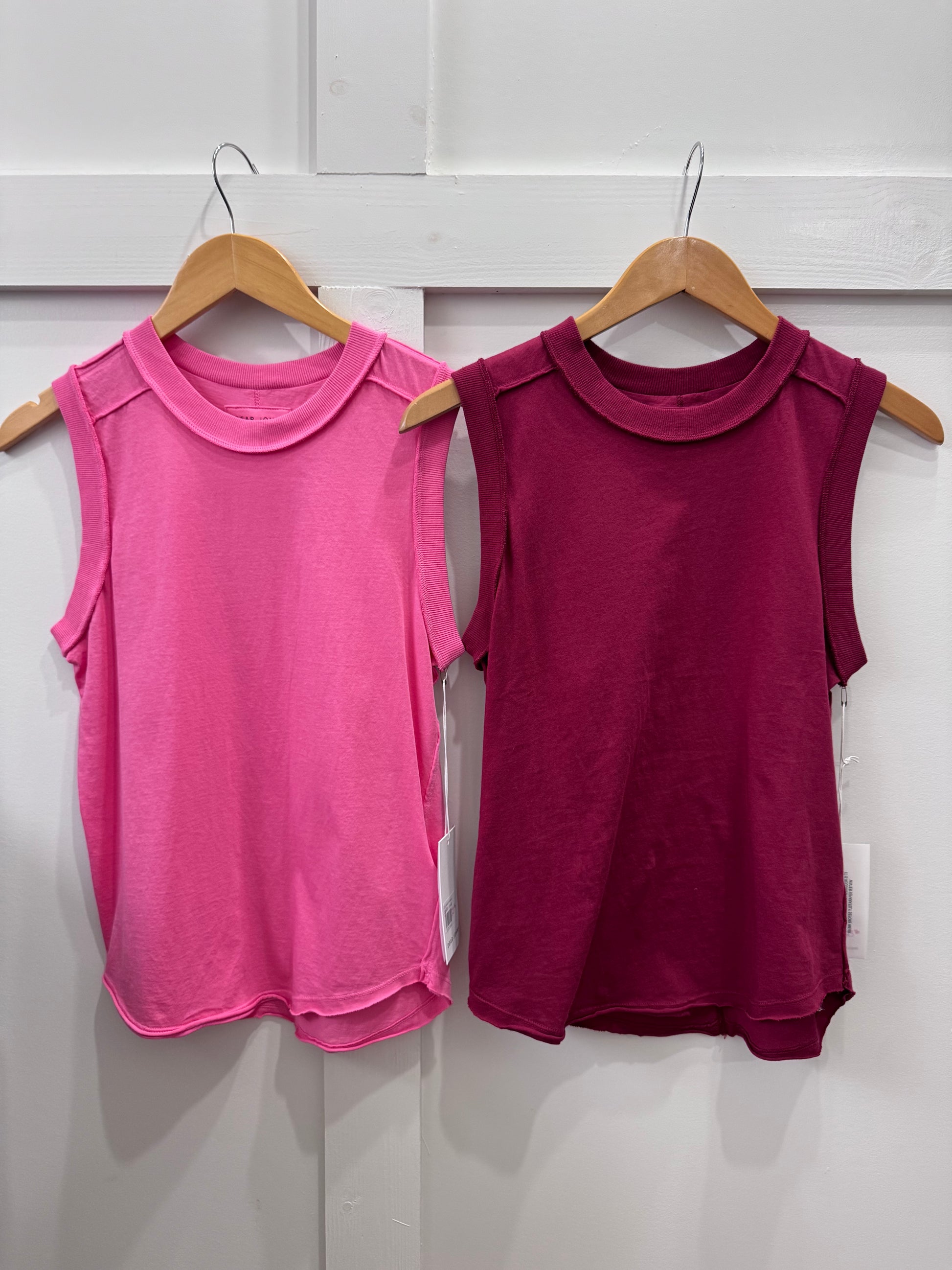Exposed seam tank from Dear John. Super soft and the quality you love and expect from this great line .available in hot pink (pink lemonade) or Tibetan Red